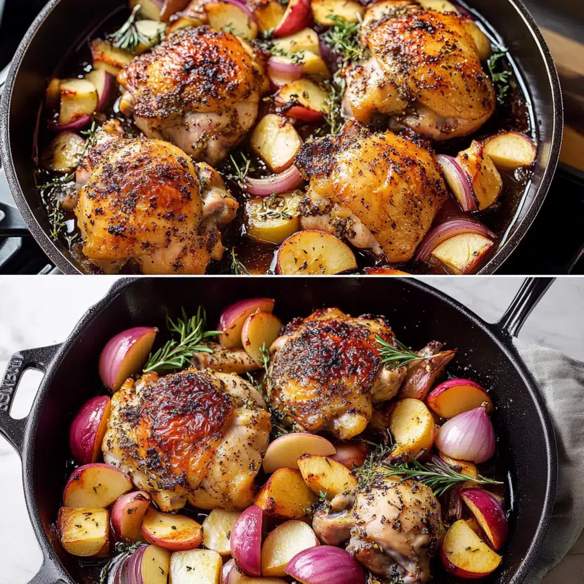 Return the seared chicken thighs back to the skillet, nestling them among the onions and apples. Using a spoon, ladle the sauce over the chicken, ensuring each piece is well-coated. Transfer the skillet to your preheated oven, and roast for 25-30 minutes until the chicken is cooked through and registers an internal temperature of 165°F (74°C), creating a mouthwatering blend of flavors.