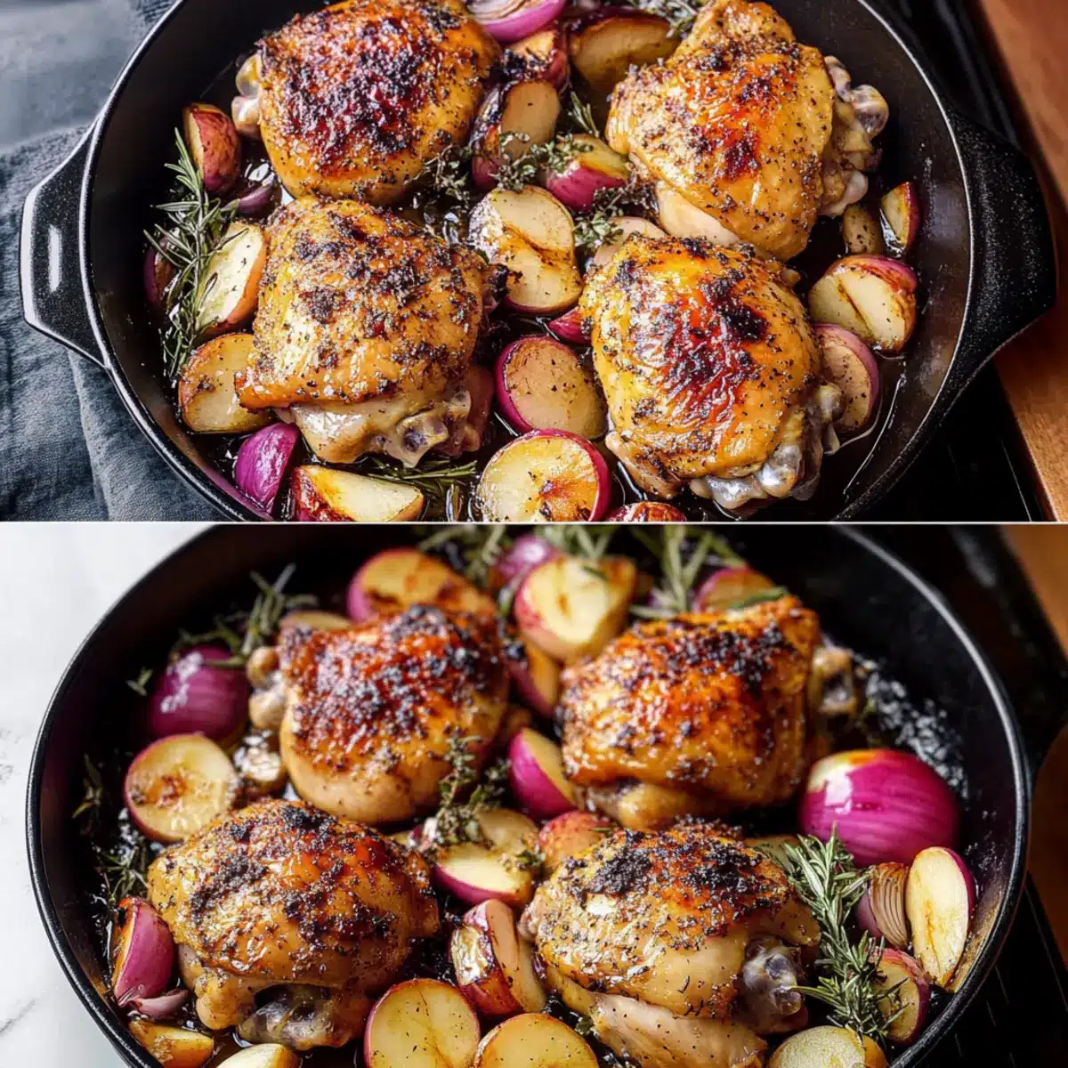 - In a large, oven-safe skillet, heat olive oil over medium-high heat. Season chicken thighs with salt and pepper, sear skin-side down for 5-7 minutes until golden brown.