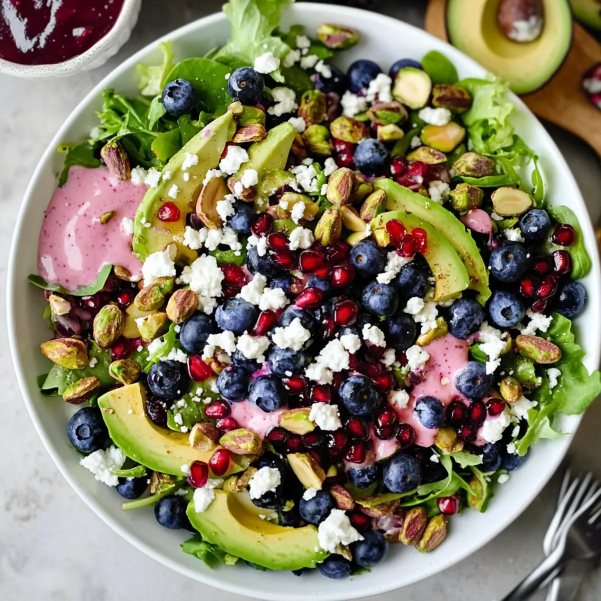 - Assemble the Salad: In a serving bowl, layer the salad greens and add the watermelon radish, avocado, red onion, blueberries, pomegranate arils, and candied pistachios.