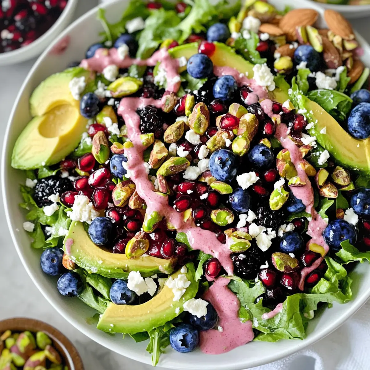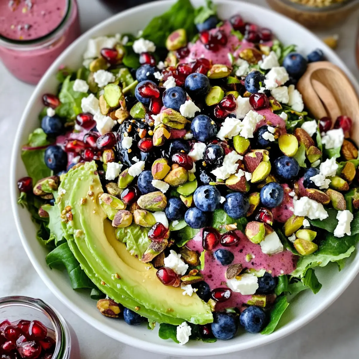 Crumble some feta cheese over the assembled salad, adding a rich, tangy flavor that complements the sweet ingredients perfectly. Drizzle your homemade creamy pomegranate dressing generously over the top just before serving, and season with freshly cracked black pepper to taste. Your Blueberry Pistachio Spring Salad is now ready to brighten your table!