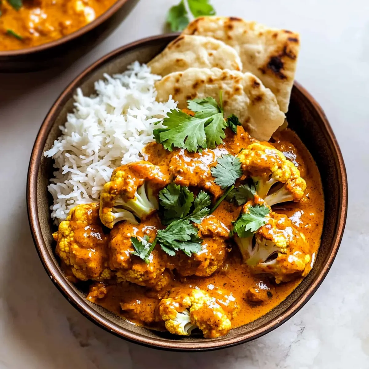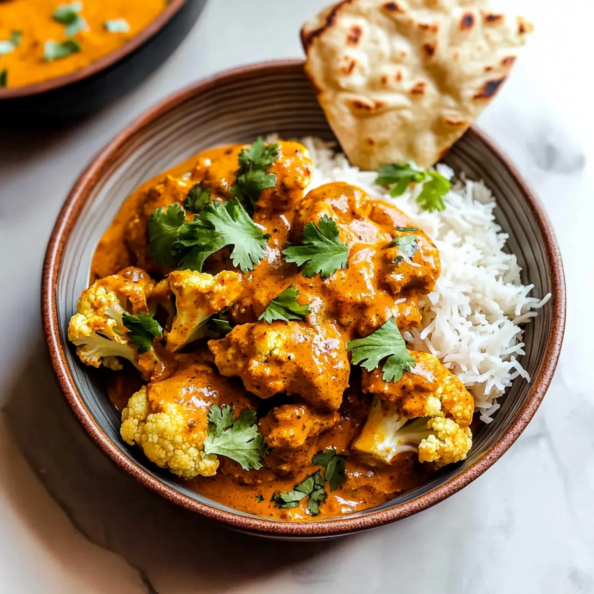 Once your Butter Cauliflower is ready, remove it from the heat. Garnish with freshly chopped cilantro for a pop of color and freshness. Serve over fluffy basmati rice, adding a dollop of whole-milk Greek yogurt on top for an extra creamy touch, making this dish a delightful vegetarian feast.