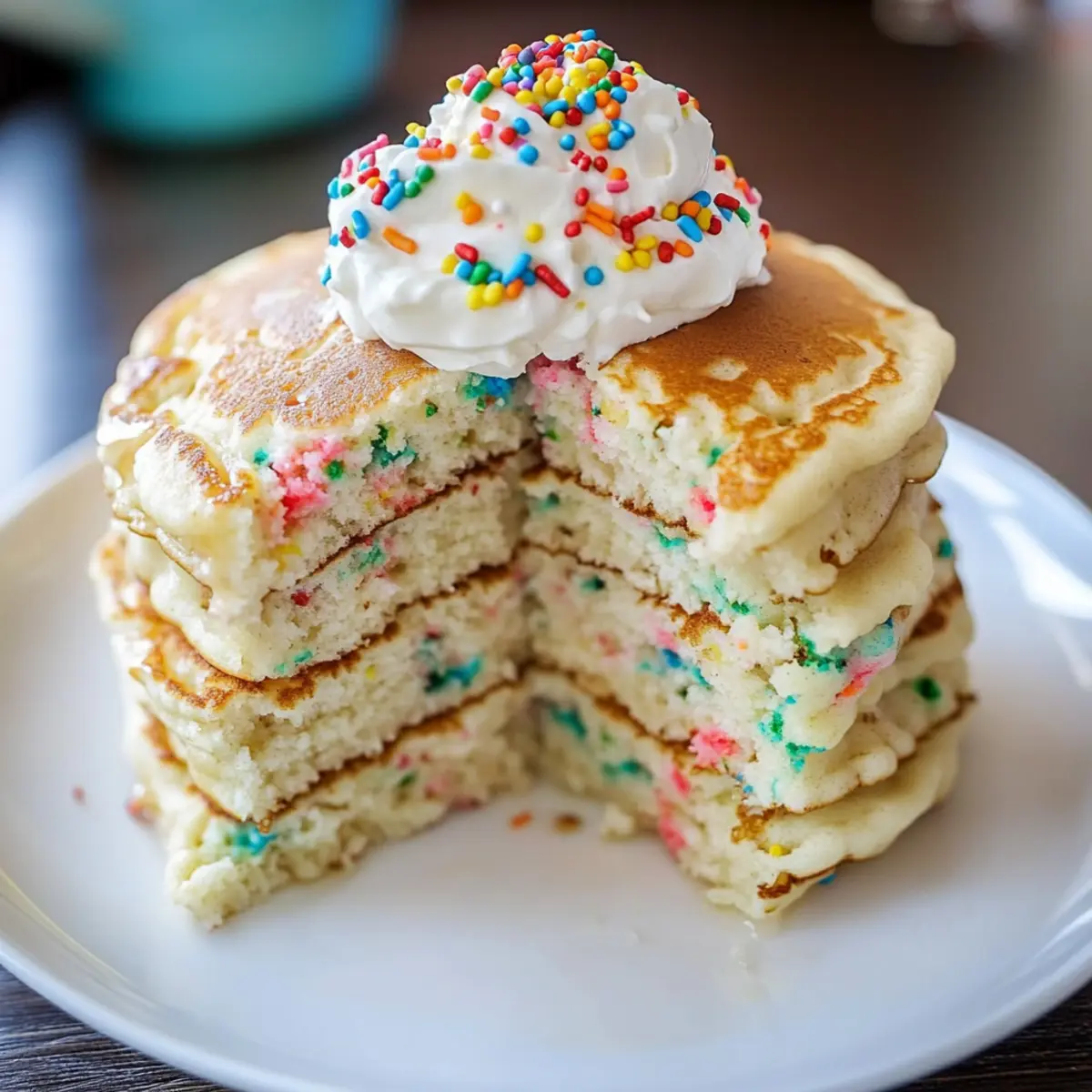 Once cooked, transfer the pancakes to a plate and keep them warm in an oven set to 250°F while you finish the batch. Top each stack with the whipped cream you prepared earlier and sprinkle with additional rainbow sprinkles for a festive finish. These Cake Batter Pancakes are ready to bring joy to your breakfast table!