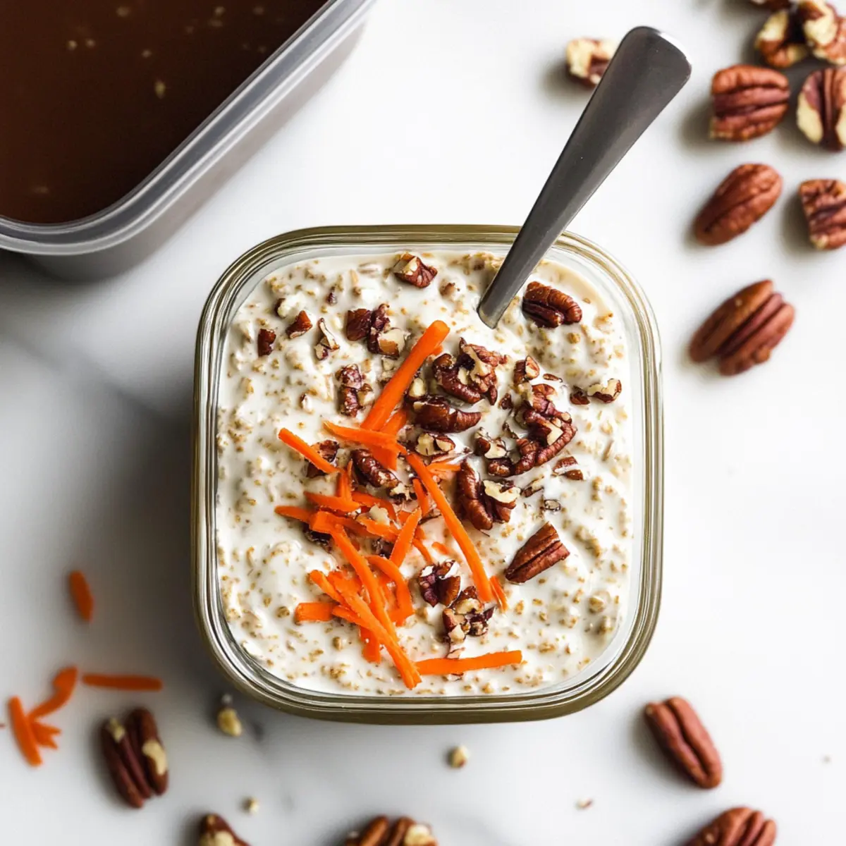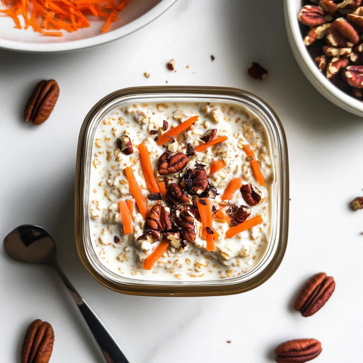 When you are ready to enjoy your Carrot Cake Overnight Oats, remove them from the refrigerator. Serve chilled in individual bowls or jars and garnish with additional shredded carrots and chopped pecans for a lovely presentation. Each spoonful is rich, creamy, and reminiscent of a classic carrot cake without the guilt!
