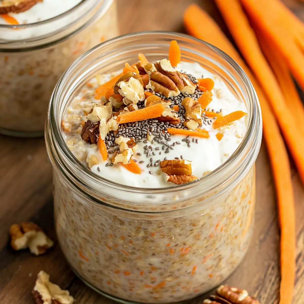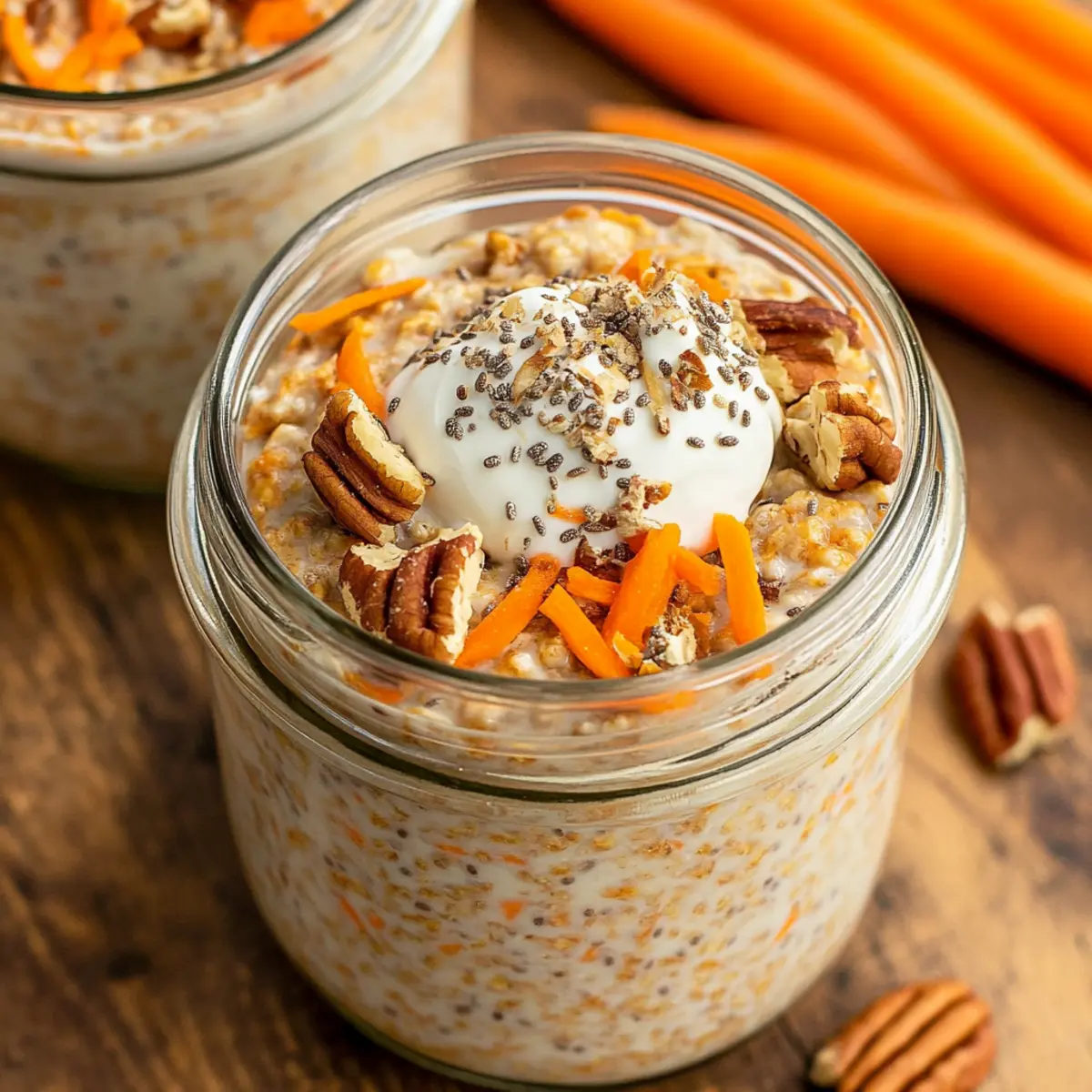 In the morning, take the jars from the fridge and give the oats a good stir. The texture should be thick and creamy. Add your choice of toppings, such as plant-based yogurt, crushed pecans, or additional shredded carrots to enhance flavor and presentation. Enjoy your delightful Carrot Cake Overnight Oats cold for a refreshing breakfast that brings joy with each bite.