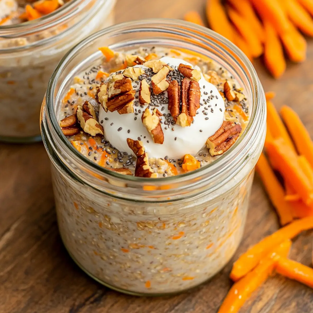These Carrot Cake Overnight Oats are ideal for meal prep, saving you time on busy mornings! You can prepare the oat mixture up to 3 days in advance, combining rolled oats, chia seeds, grated carrots, spices, oat milk, maple syrup, and vegan cream cheese in an airtight container. Just mix everything well to ensure uniform flavor before refrigerating. To maintain quality, be sure to keep the jars sealed, which helps prevent browning and keeps them fresh. When you’re ready to enjoy, simply stir the oats and top with your favorite toppings, like plant-based yogurt or crushed pecans, for a delicious, nutritious breakfast that tastes just as delightful as freshly made!