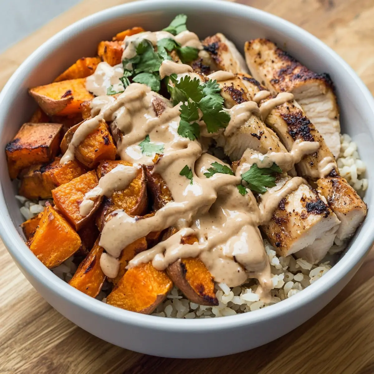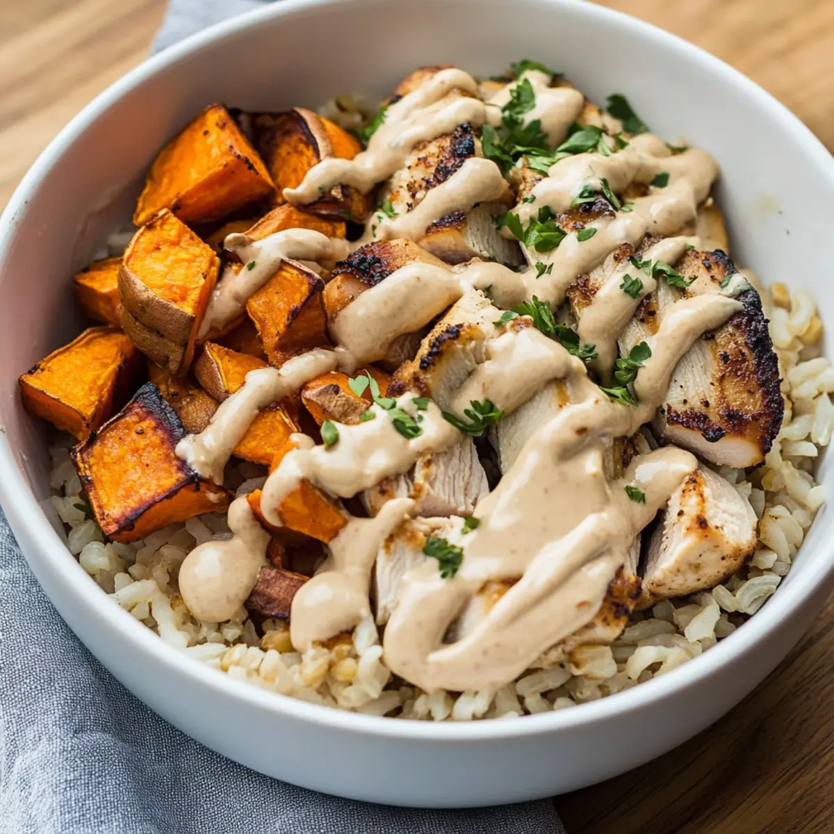 - Assemble the bowl with rice, followed by sweet potatoes and sliced chicken. Drizzle with tahini sauce.
