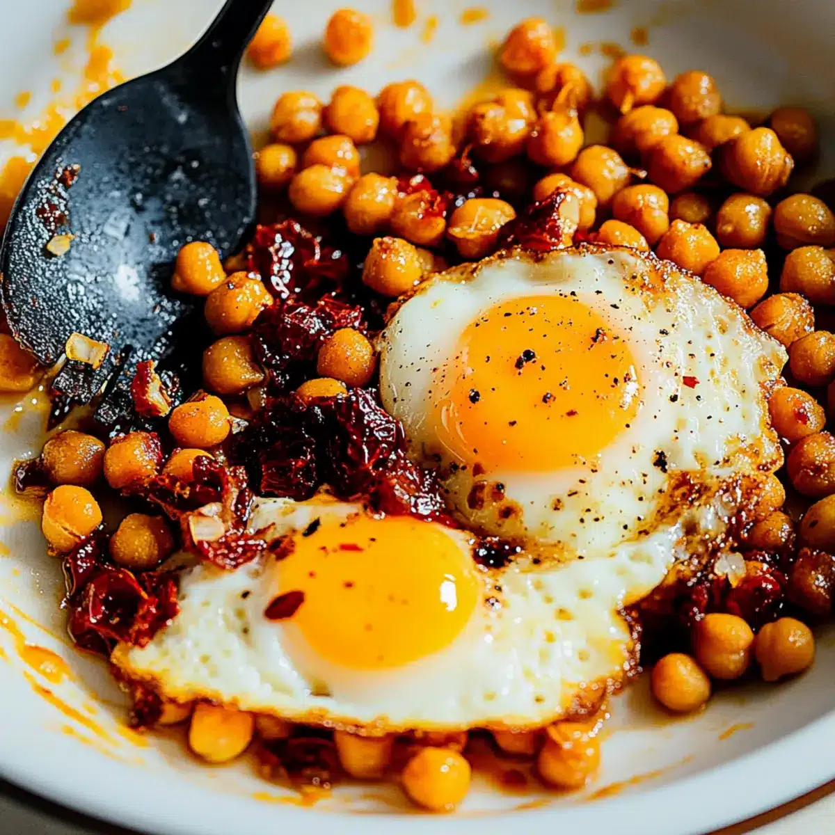 Once the chickpeas reach the desired crispiness, reduce the heat to medium-low and carefully remove half of the chickpeas from the skillet. With the remaining chickpeas, create two small holes in the mixture, where the eggs will go. Drizzle a little oil from the sundried tomatoes into each hole to prevent sticking, ensuring the eggs will cook beautifully.