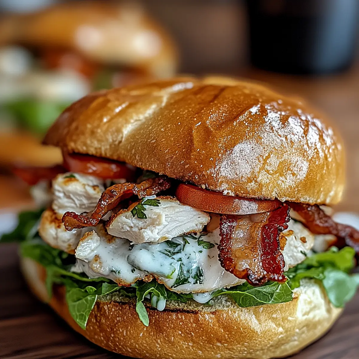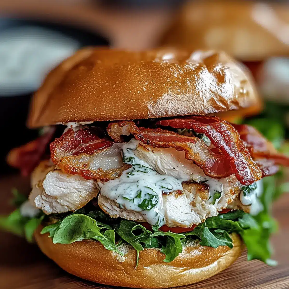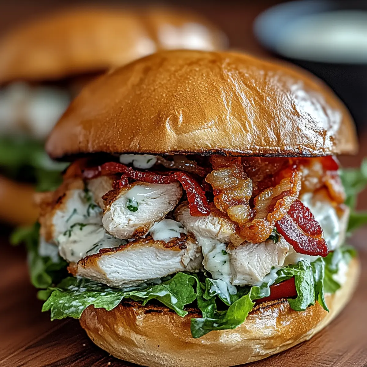- Assemble Sandwich: Spread ranch dressing on both sides of the warm bread. Layer chopped chicken, crispy bacon, lettuce, tomato, onion, and optional extras. Close and cut in half.