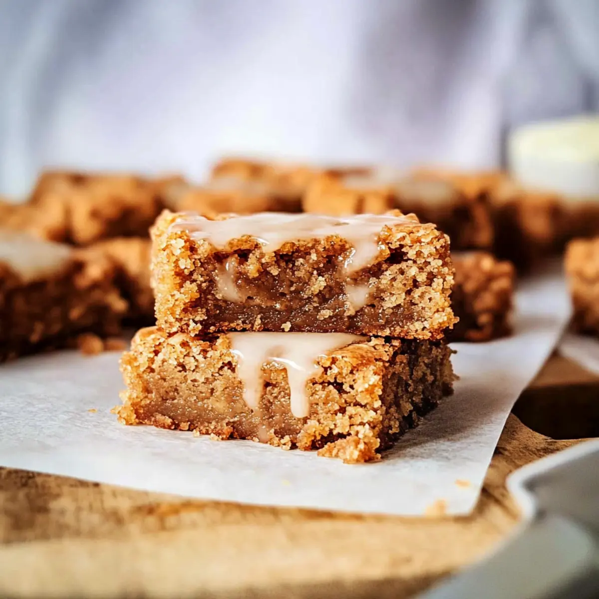 - Drizzle the glaze over cooled blondies, cut into squares, and serve.