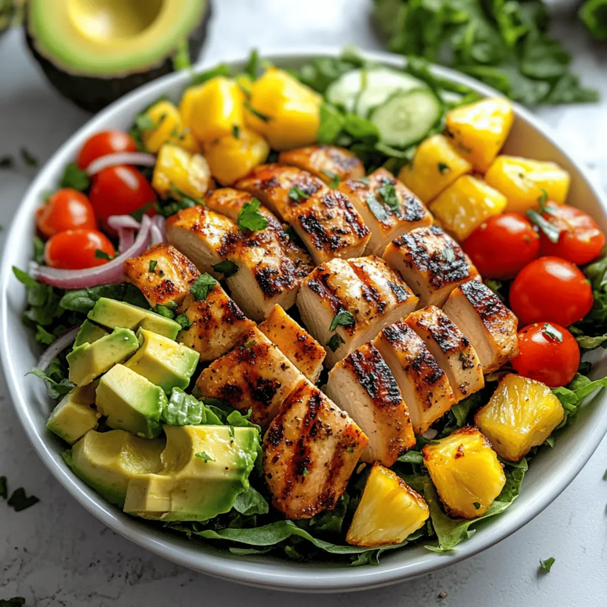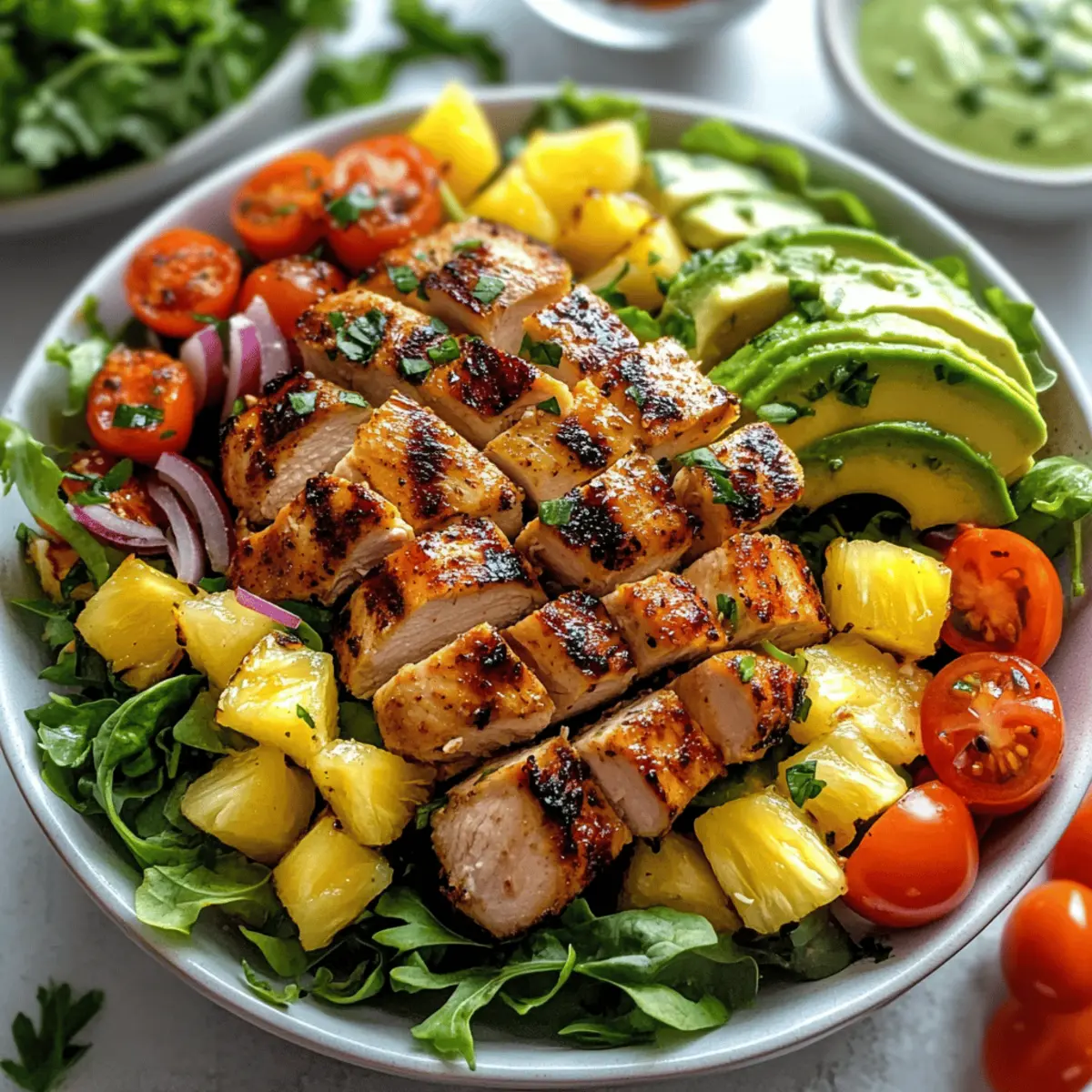 - On a platter, arrange chopped romaine lettuce, then top with sliced avocado, red onion, cherry tomatoes, quinoa, chicken slices, and seared pineapple.