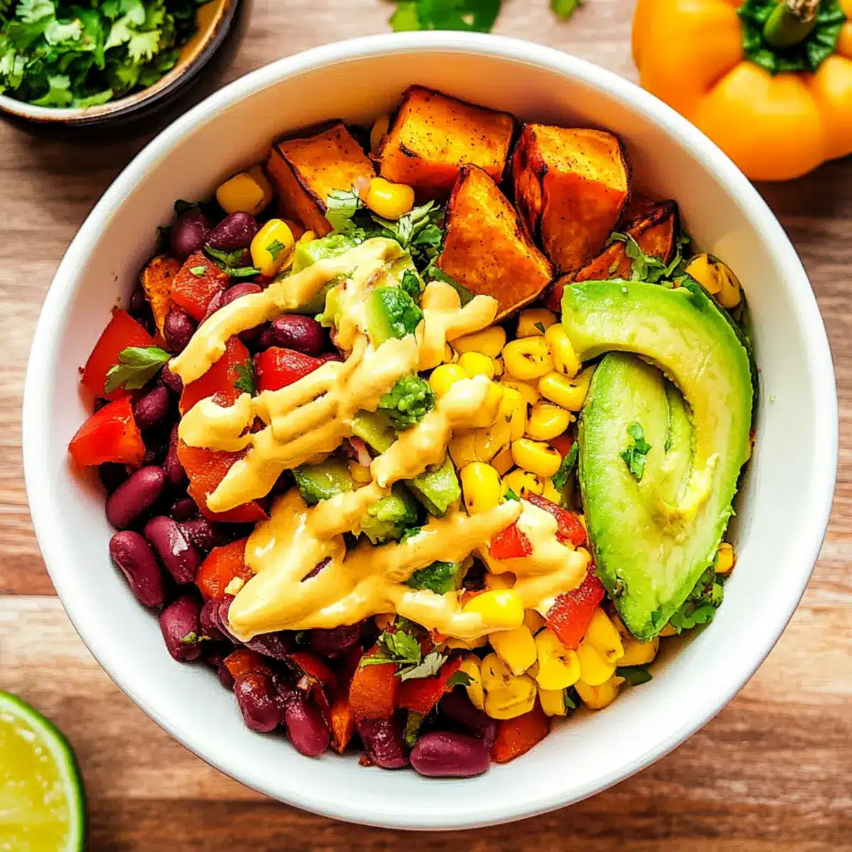 These High-Protein Vegan Fiesta Salad components are perfect for meal prep, making your weeknight dinners a breeze! You can roast the sweet potatoes and bell peppers up to 24 hours in advance, storing them in the refrigerator to maintain their freshness. The creamy vegan queso can also be blended ahead of time and refrigerated for 3 days; just give it a good stir before serving to restore its creaminess. To preserve the texture of the avocado, slice it just before serving. When you’re ready to enjoy, simply combine the prepped ingredients in a bowl, drizzle with queso, and savor a delicious meal that’s as convenient as it is delightful!