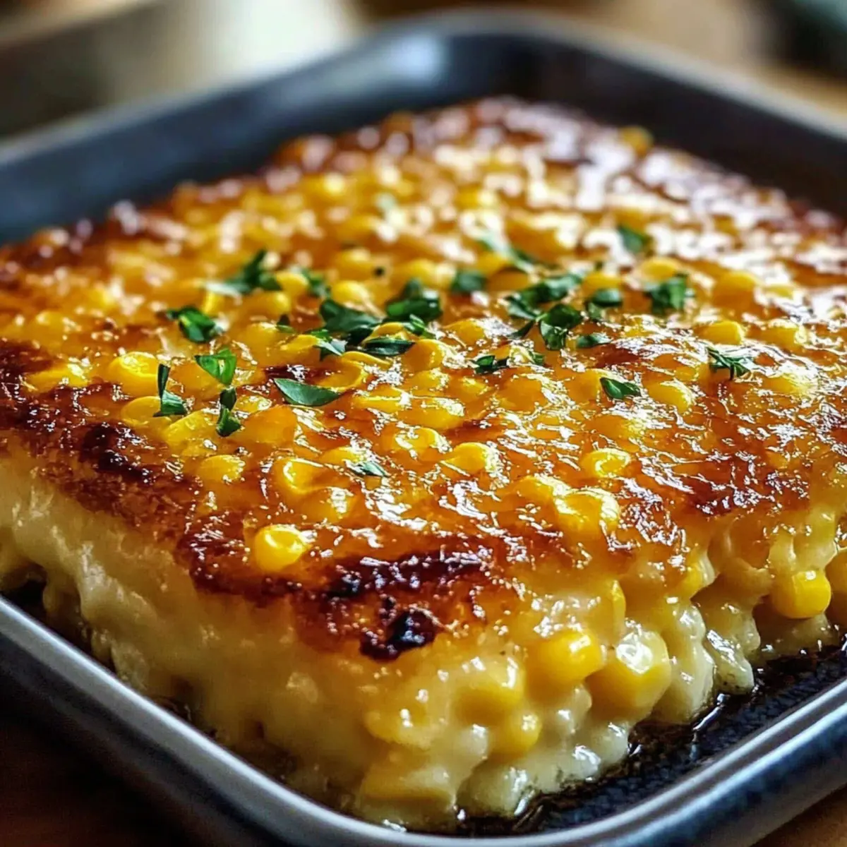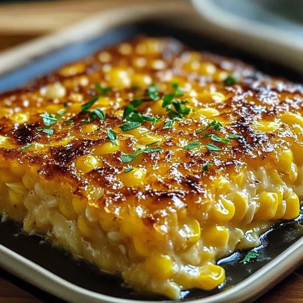 Once baked, remove the Honey-Glazed Corn Casserole from the oven and allow it to cool slightly for about 10 minutes. This resting period enhances the flavors and allows for easy serving. Finally, garnish with chopped chives or parsley to add a touch of freshness and color before enjoying!