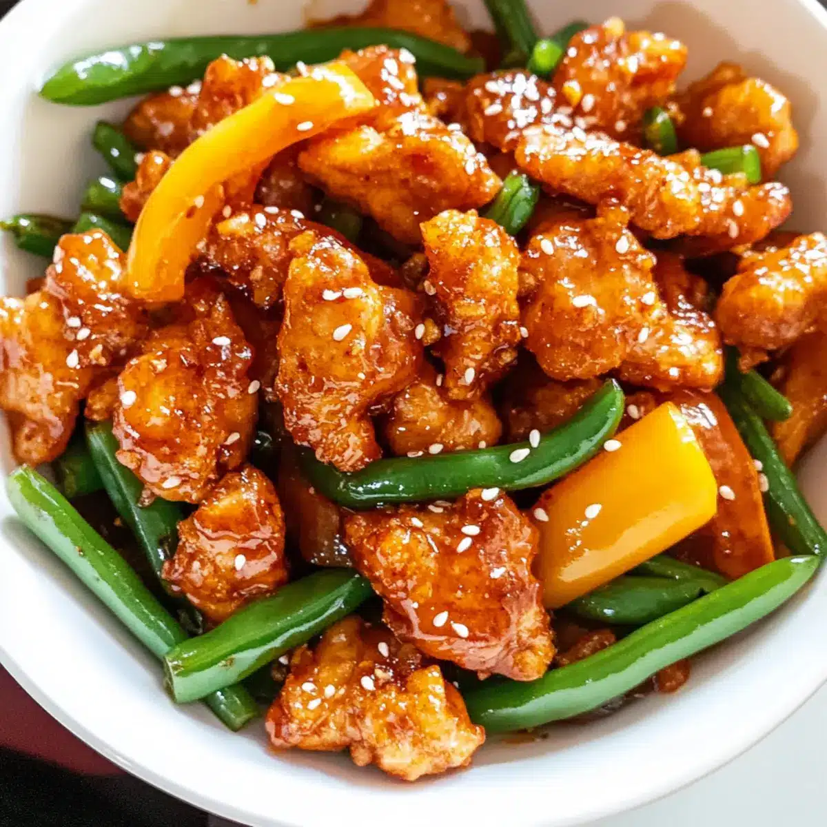 Add the crispy chicken to the sauce, tossing gently to coat each piece evenly. Then, incorporate the sautéed bell peppers and green beans, mixing until everything is well-combined and coated. This final step ensures your Honey Sesame Chicken is flavorful and satisfying.