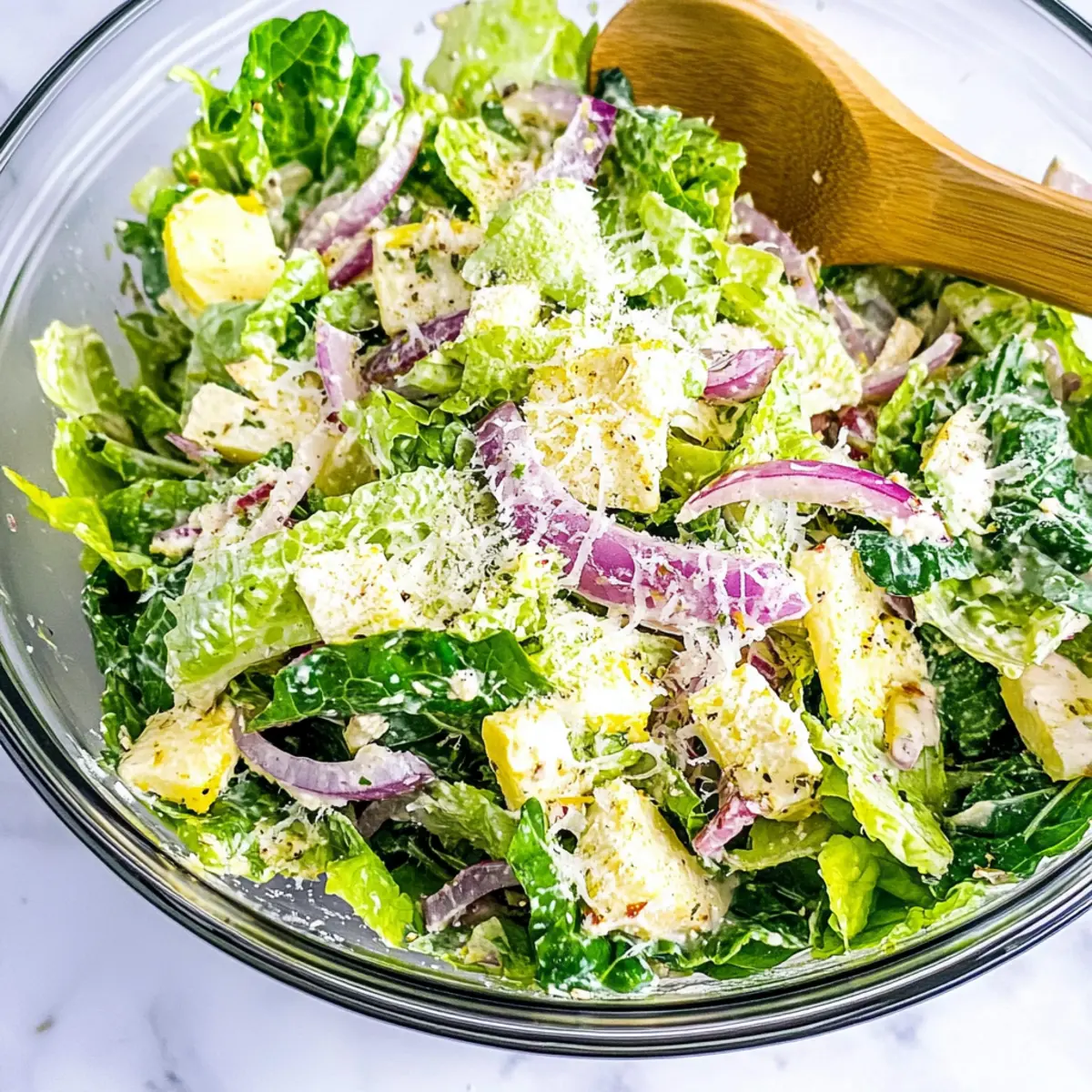 In a large mixing bowl, add 4 cups of chopped Romaine lettuce for a crisp base. Then, incorporate ½ cup of grated Parmesan cheese, ¼ cup of thinly sliced red onion, and a sprinkle of crushed red pepper flakes for a flavor kick. Toss the ingredients gently with your hands or salad tongs for about 15 seconds until all are evenly distributed, allowing vibrant colors and textures to come together beautifully.