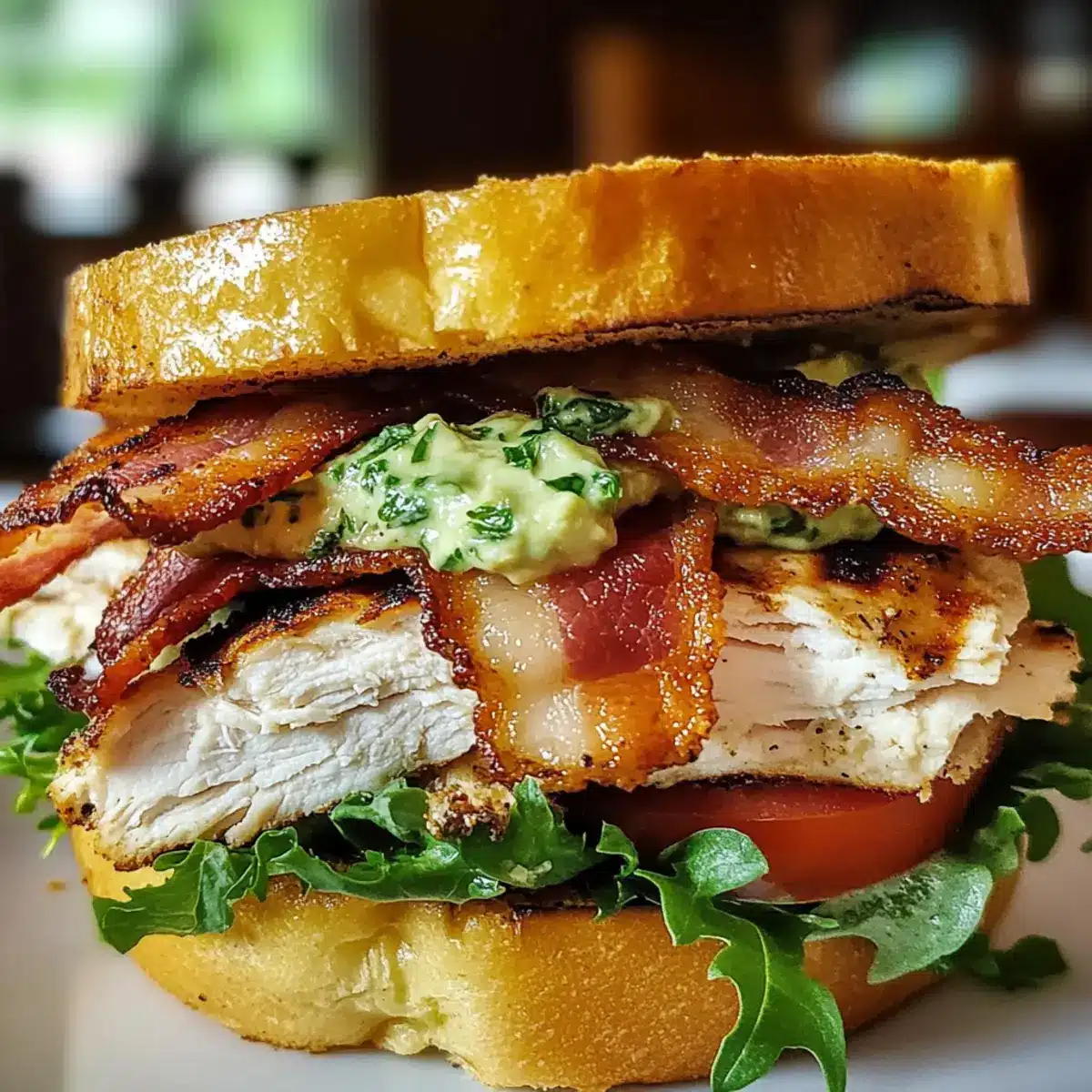 - Assemble the sandwich with the avocado ranch mixture, followed by lettuce, tomato slices, grilled chicken, cheese, and bacon.