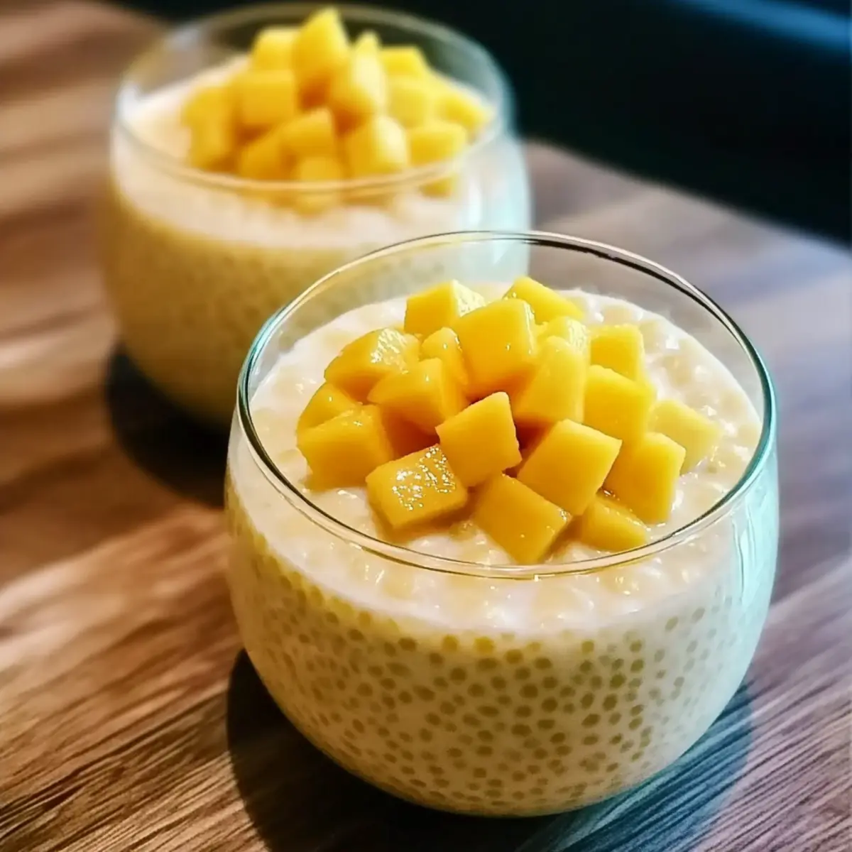 - Scoop the Mango Sago into serving bowls, top with remaining mango pieces, and chill for 15 minutes before serving.