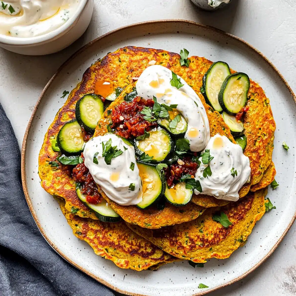 Homemade Yogurt Sauce: A dollop of tangy yogurt sauce with herbs offers creaminess that complements the pancakes while adding a touch of freshness.