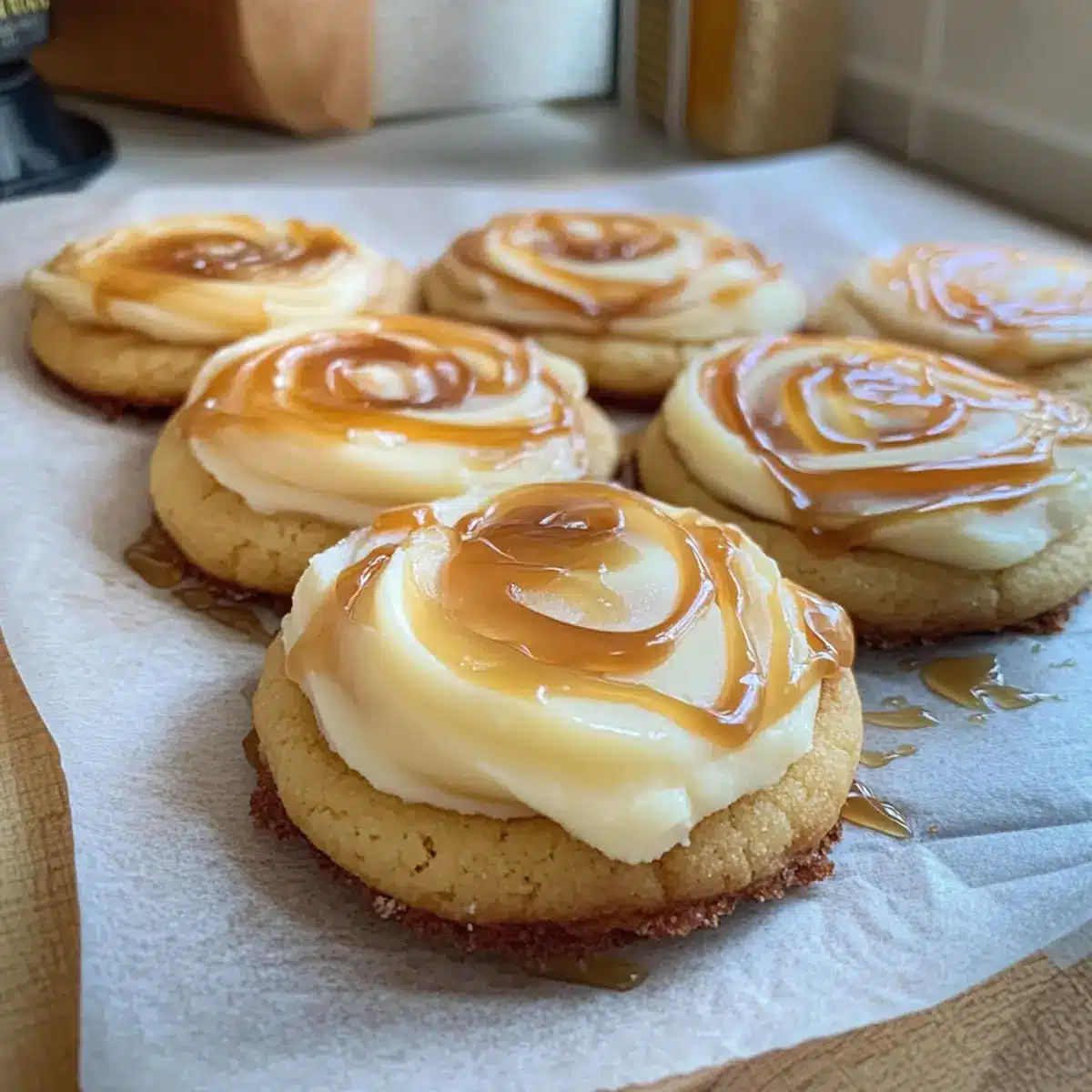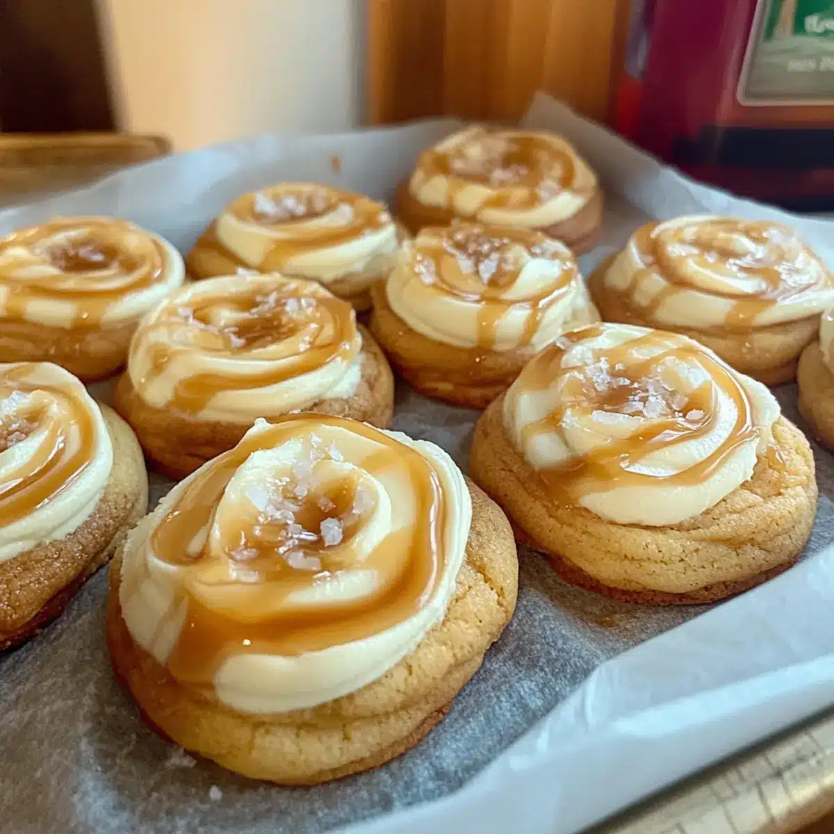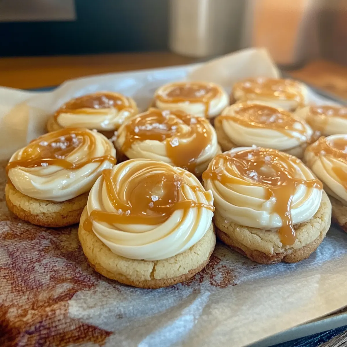 To create a delicious topping, melt 8 ounces of caramels with a splash of milk in a microwave-safe bowl. Heat in 30-second intervals, stirring in between, until smooth and pourable. Once the cookies are completely cooled and frosted with the cream cheese mixture, generously drizzle the melted caramel over the top and sprinkle lightly with sea salt for that perfect sweet and salty balance.