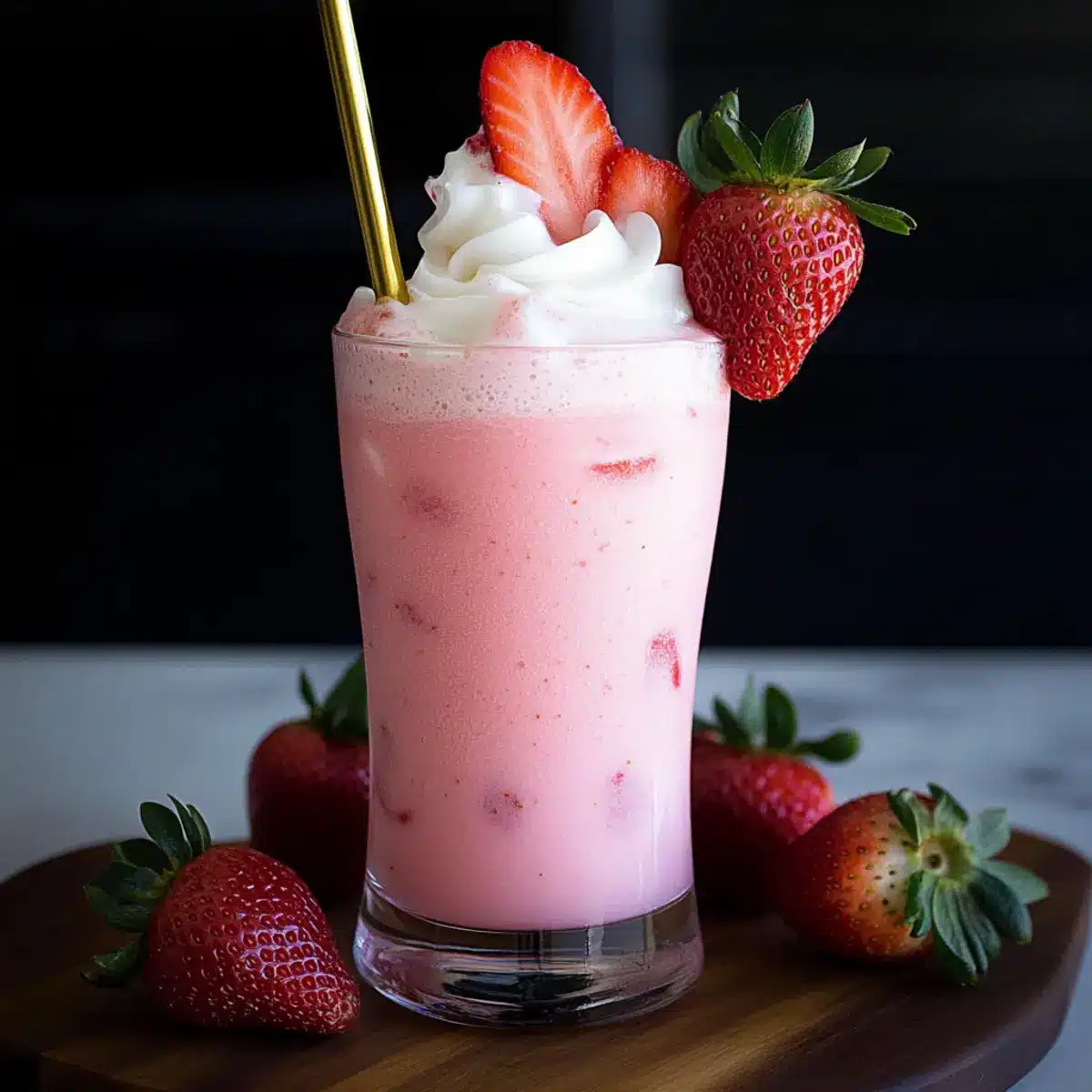 - Top the drink with prepared whipped cream and garnish with fresh strawberries. Serve immediately.