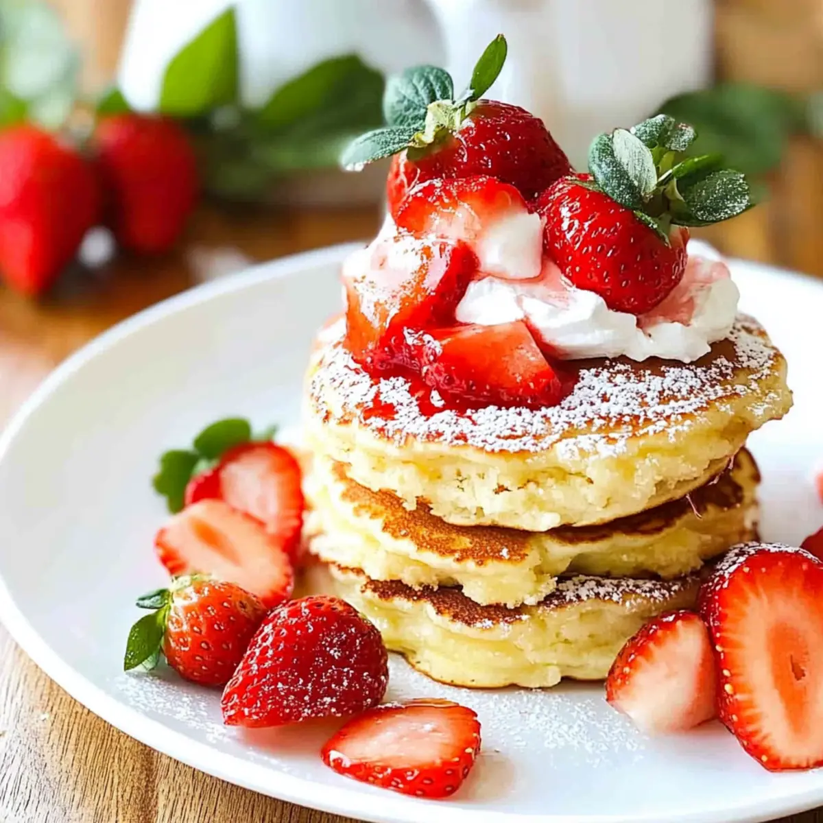 - Serve and Garnish: Stack pancakes on plates, drizzle with strawberry sauce, add whipped cream, and garnish with fresh strawberries. Serve warm.