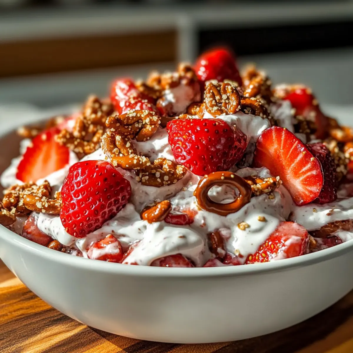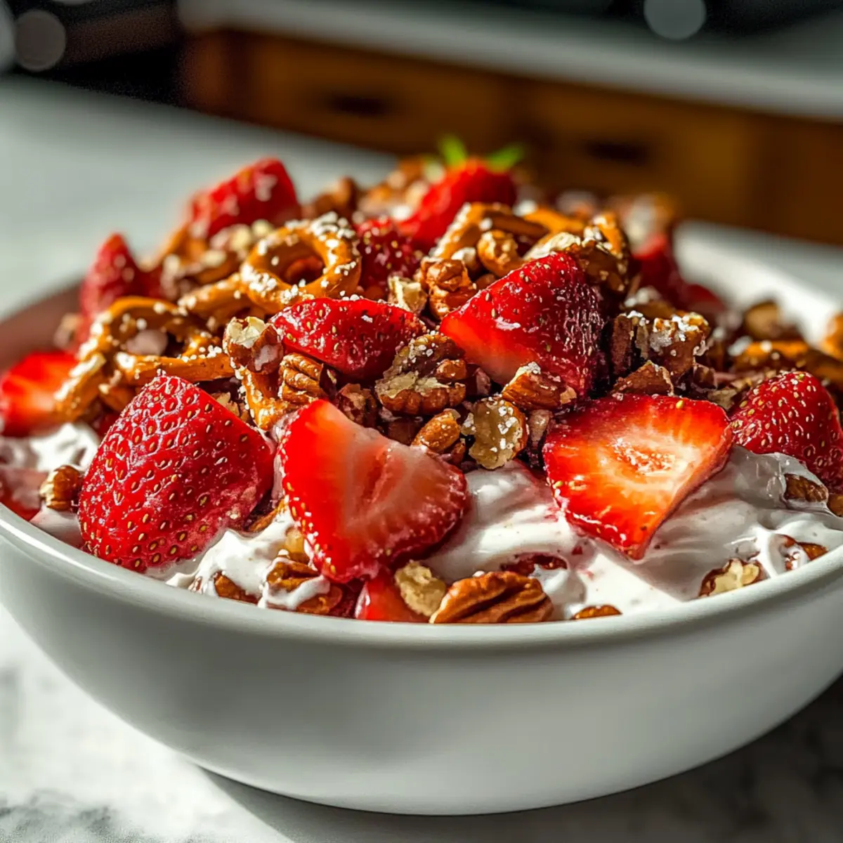 - Combine half of the cooled pretzel crunch into the strawberry mix, then top with remaining crunch before serving.