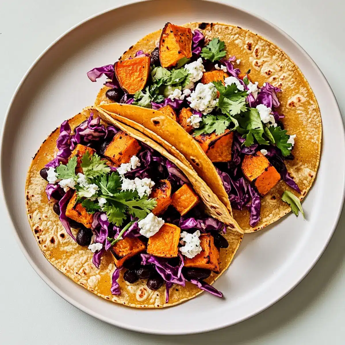 To create your delicious sweet potato tacos, warm your corn tortillas in a dry skillet over medium heat for about 30 seconds on each side, or until pliable. Divide the sweet potato and black bean mixture evenly among the tortillas. Top with the vibrant cabbage slaw, and sprinkle goat cheese or avocado if desired, bringing vibrant flavors and textures to each bite.
