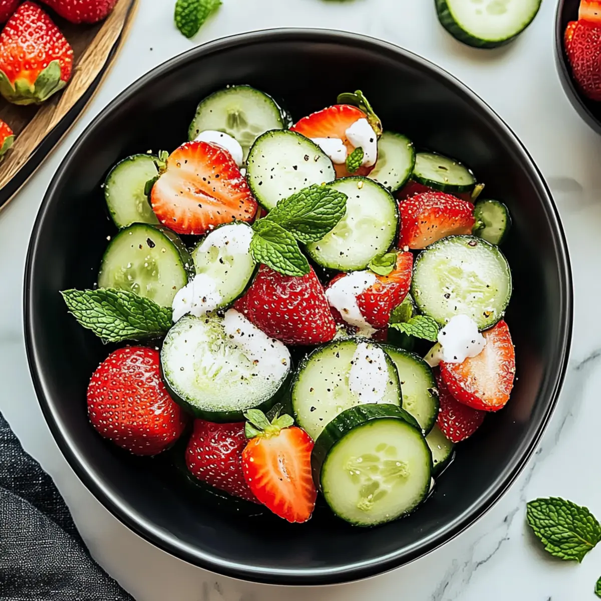 - Pour the dressing over the cucumber and strawberries and gently toss to coat.